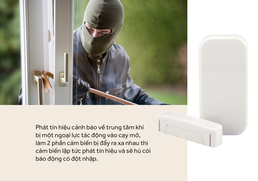 Chuông cửa mang hình: Đây là vật dụng giúp bạn nhận diện và trò chuyện có người vừa bấm chuông ngay trong nhà, nhờ ấy bạn có giảm thiểu đối mặt mang các vị khách lạ.- Hệ thống camera IP: Là hệ thống an ninh giám sát ghi nhận mọi hình ảnh đang diễn ra trong và ngoài ngôi nhà, cho phép bạn có thể giám sát tình hình ở mọi nơi đặt camera mọi lúc mọi nơi. Bởi thế, dù đang công tác xa nhưng chỉ cần duyệt smartphone, laptop,… bạn hoàn toàn sở hữu thể giám sát an ninh của ngôi nhà bạn.Cảm biến mở cửa và kính vỡ: Thiết bị báo động khi cửa bị cạy, mở trái phép hay kính bị vỡ lẽ.bảo vệ toàn diện cả bên ngoài lẫn bên trong- Hệ thống an ninh vòng ngoài: Là các dấu hiệu báo động truyền cảnh báo bằng tin nhắn tới gia chủ khi sở hữu người đột nhập trái phép từ cổng, tường rào.